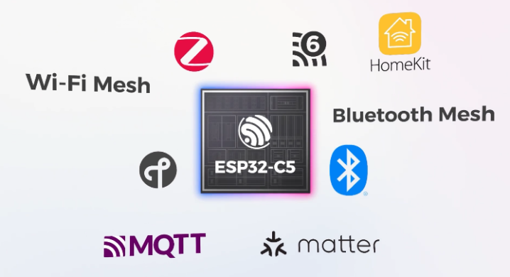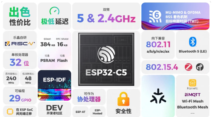 ESP32-C5宣称是行业首款2.4&5GHz双频Wi-Fi6的RISC-VSoC,同时集成Bluetooth5(LE)和IEEE802.15.4(Zigbee,Thread)协议栈,为物联网设备提供无线连接解决方案。