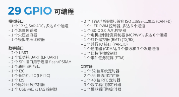 ESP32-C5还集成了一个40MHz低功率(LP,LowPower)内核,可作为低功耗应用的主处理器。